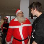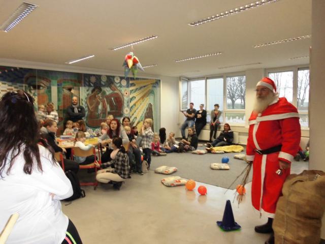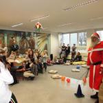So ließ er auch nicht lange auf sich warten. Mit dem Schallen der Glöckchen stand er auf einmal im Raum umgeben von Kindern und Schülern, mit dem Ziel seine Geschenke zu verteilen. Die Kinder bekamen jeweils kleine Geschenke und auch die großen „Kinder“ kamen nicht zu kurz. Zweimal kam leider auch die Rute zum Einsatz.