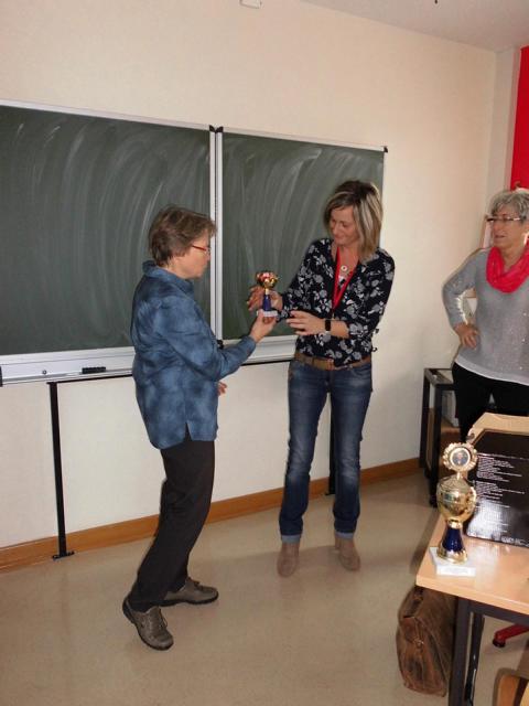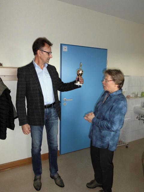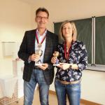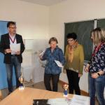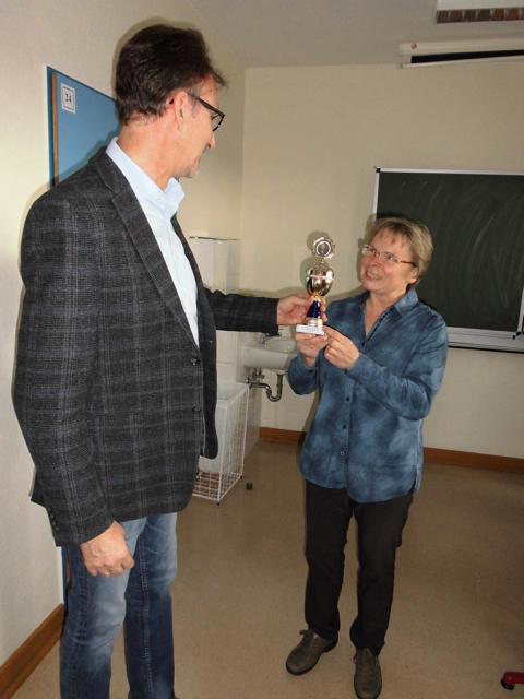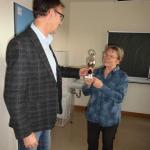 Doch was ist ein Schulleiter ohne seine Chefsekretärin? Seit 1999 übt Andrea Behrens diesen Posten zur vollsten Zufriedenheit aller bisheriger Schulleiter aus. Ebenfalls unter begeisterndem Beifall der Anwesenden konnte auch sie einen mit Süßigkeiten gefüllten Ehrenpokal, eine Goldmedaille, eine Urkunde sowie einen Gutschein in symbolischer Höhe von 10 Euro in Empfang nehmen.