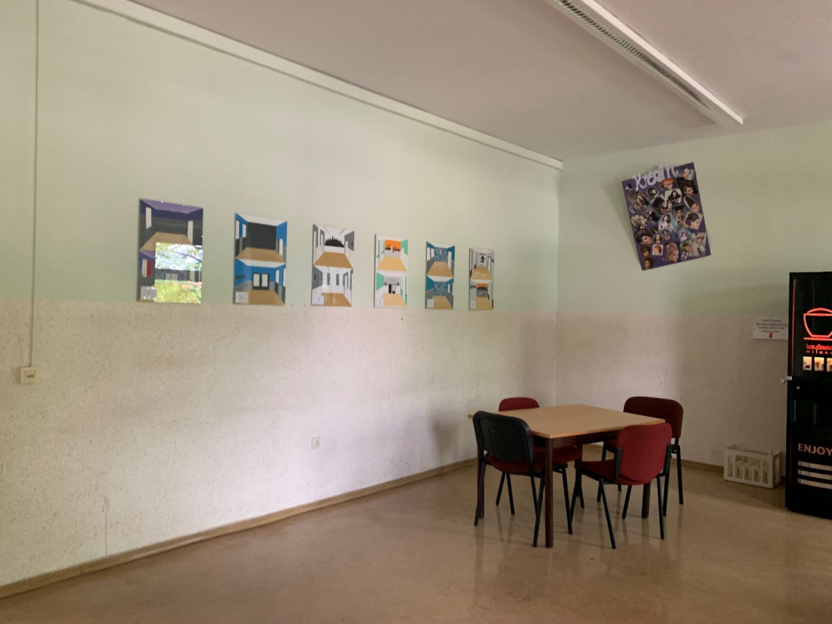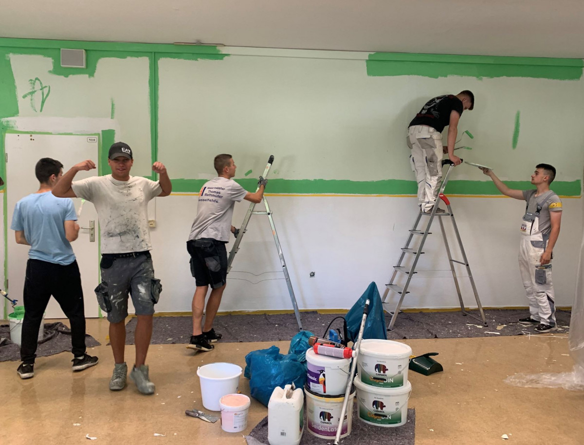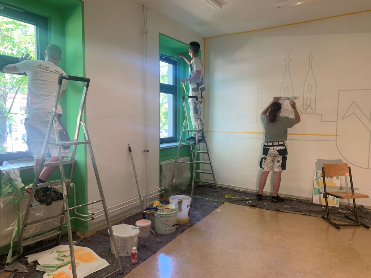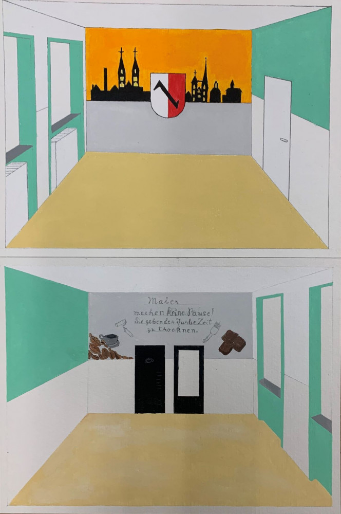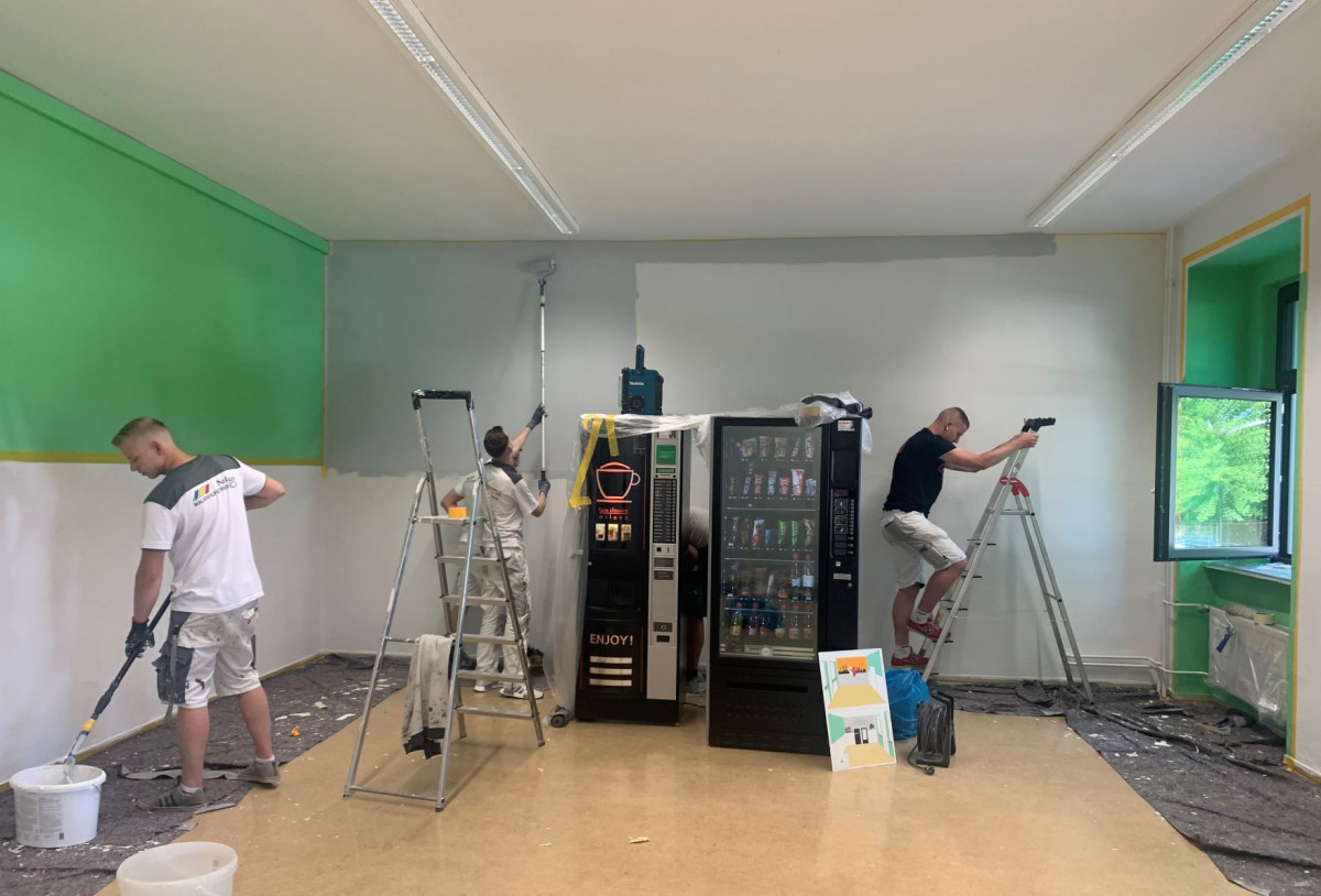 Der Pausenraum der BbS Geschwister Scholl Halberstadt am Standort Neupertstraße sollte neugestaltet werden. Ausgelobt wurde hierzu im Schuljahr 2021/22 ein interner Wettbewerb der Klassen Maler/ Lackierer. Insgesamt nahmen 14 SchülerInnen des ersten Lehrjahres (ML21) und 14 SchülerInnen des zweiten Lehrjahres (MFT20) teil. Nach ersten Ideen und Skizzen der TeilnehmerInnen fanden sich diese in Gruppen zusammen und fertigten insgesamt 6 farbige Entwürfe an, die in der Schule ausgehängt wurden. In einer geheimen Wahl, zwei Wochen vor den Pfingstferien, erhielten alle SchülerInnen der Schule (Standort Neupertstraße) die Möglichkeit abzustimmen. Gewonnen hat ein Entwurf aus der Klasse MFT20 (2. Lehrjahr).