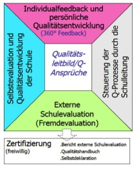 Die Schule legt im Q-Leitbild die Qualitäten (Werte, Normen, Standards) fest, nach denen sie sich beurteilen lassen bzw. selber evaluieren will. Im Q-Leitbild werden die Qualitätsansprüche definiert (Soll-Aussagen), mit denen die Schule die reale Praxis (Ist-Zustand) vergleichen möchte.